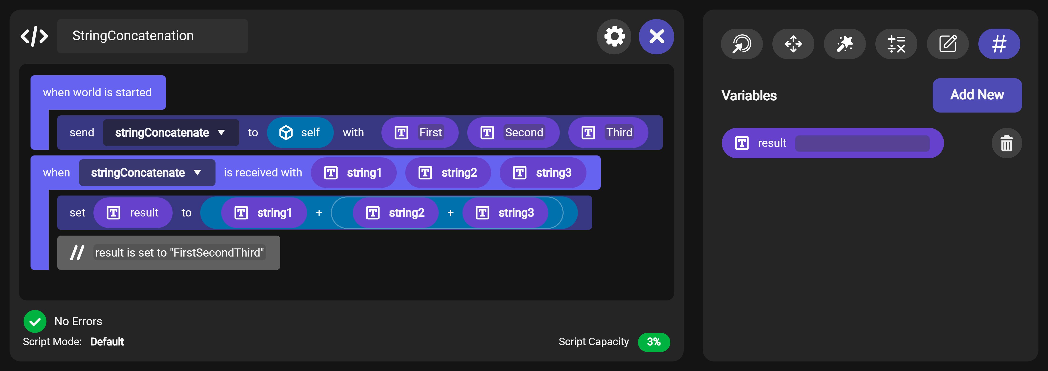 - Next, we send a message called “stringConcatenate” to “self.” In Meta Horizon Worlds, “self” refers to the object or entity that the script is attached to – in this case, the world itself.